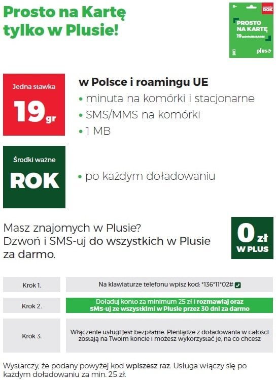 W ofercie Prosto na Kartę Plus przewidział jeszcze dwa udogodnienia. Po pierwsze, po każdym doładowaniu konta kwotą minimum 25 złotych klient może przez 30 dni kalendarzowych korzystać z nielimitowanych rozmów i SMS-ów ze wszystkimi w Plusie. Usługę należy włączyć jednak kodem *136*11*02#, ale wystarczy to zrobić tylko raz. Środki z doładowania pozostają na koncie, więc użytkownik może je przeznaczyć na przykład na rozmowy i SMS-y do innych sieci.
