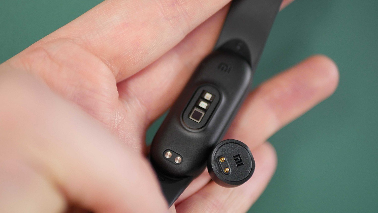 Od spodu znajdziemy zestaw czujników. Przede wszystkim jest tu pulsometr monitorujący bicie naszego serca. Podświetla się on podczas pracy na kolor zielony. Jest tu także pulsoksymetr do weryfikacji nasycenia krwi tlenem. Ten z kolei podświetla się na czerwono. Poza nimi jest tu jeszcze miejsce na podłączenie ładowarki do dwóch pinów.