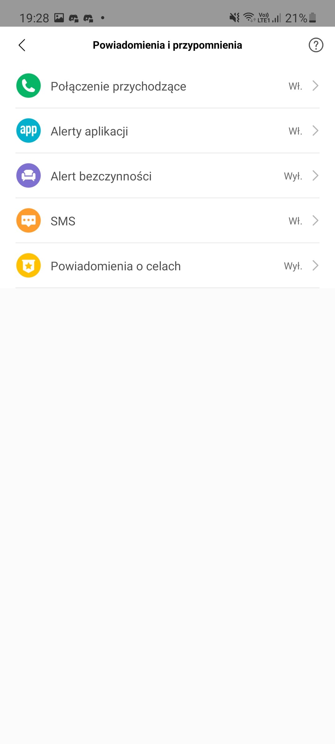 - powiadomienia i przypomnienia, gdzie znajdziemy ustawienia odnośnie połączeń (włączenie alertów, pokazywanie informacji o kontakcie, opóźnienia oraz wspomniane automatyczne odpowiedzi), alerty aplikacji (wybór, z których programów mamy otrzymywać powiadomienia i czy mają przychodzić przy włączonym ekranie smartfona), alert bezczynności (przypomnienie o wykonaniu jakiejś aktywności po godzinie bezruchu, można ustalić w jakich godzinach mamy otrzymywać takie powiadomienia), SMS (możliwość włączenia powiadomień na opaskę o przychodzących wiadomościach SMS), powiadomienia o celach (włączanie informacji o osiągnięciu na przykład ustalonego celu kroków),