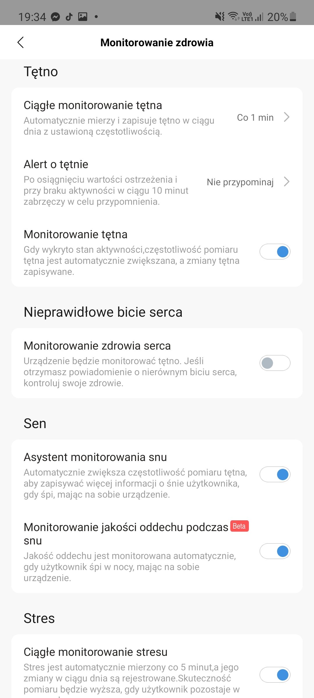 - monitorowanie zdrowia, gdzie znajdziemy ustawienia częstotliwości automatycznego monitorowania tętna (co minutę, 5, 10 i 30 minut lub tylko pomiar ręczny), włączenie alertów o zbyt wysokim tętnie, monitorowania zdrowia serca, asystenta monitorowania snu i oddechu podczas snu oraz ciągłego analizowania stresu,