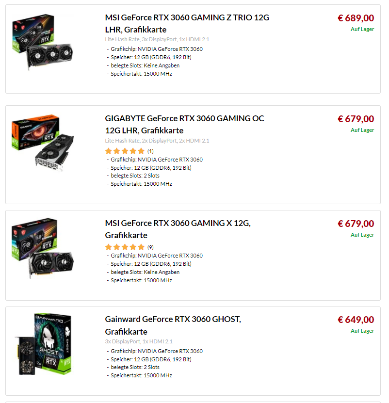 | GeForce RTX 3060 Ti | 419 euro | 750 euro |