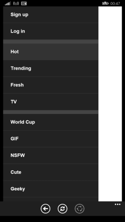 Górna belka, chowająca się w trakcie przeglądania zamieszczonych na stronie obrazków to odnośnik do opcji aplikacji – przeniesienia się do panelu użytkownika, wybrania sekcji przeglądanych treści – Hot, Trending, Fresh, TV, a niżej – wybrania tych spośród popularnych obecnie tagów. Na samym dole możemy odznaczyć opcję „Safe Mode”, która jest przyciskiem służącym do ukrywania treści, które mogą być odrobinę zbyt pikantne, a tym samym wyświetlanie ich może narazić nas na srogie spojrzenia osób o nieco surowszej moralności.