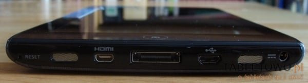 Dolny panel urządzenia to pasmo wspomnianych wyżej złącz: microHDMI, microUSB, ale znajdziemy tu także reset, dwa głośniczki, gniazdo zasilania oraz port do stacji dokującej. Po przeciwległej stronie tabletu jest natomiast mikrofon, przycisk zasilania/wznowienia z uśpienia oraz gniazdo słuchawkowe 3.5 mm.
