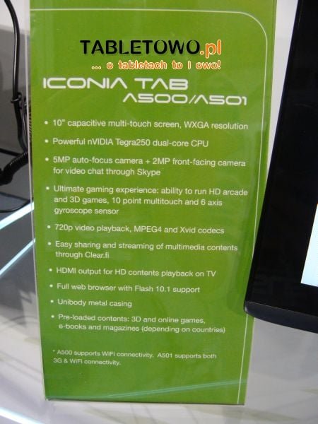 Bardzo miło ze strony Acera, że rozgraniczył nieco innymi nazwami modele z 3G od tych z samym WiFi. I tak, wiemy już, że na rynku pojawi się Acer Iconia Tab A500 – wyłącznie z WiFi oraz Acer Iconia Tab A501 – z 3G i WiFi.