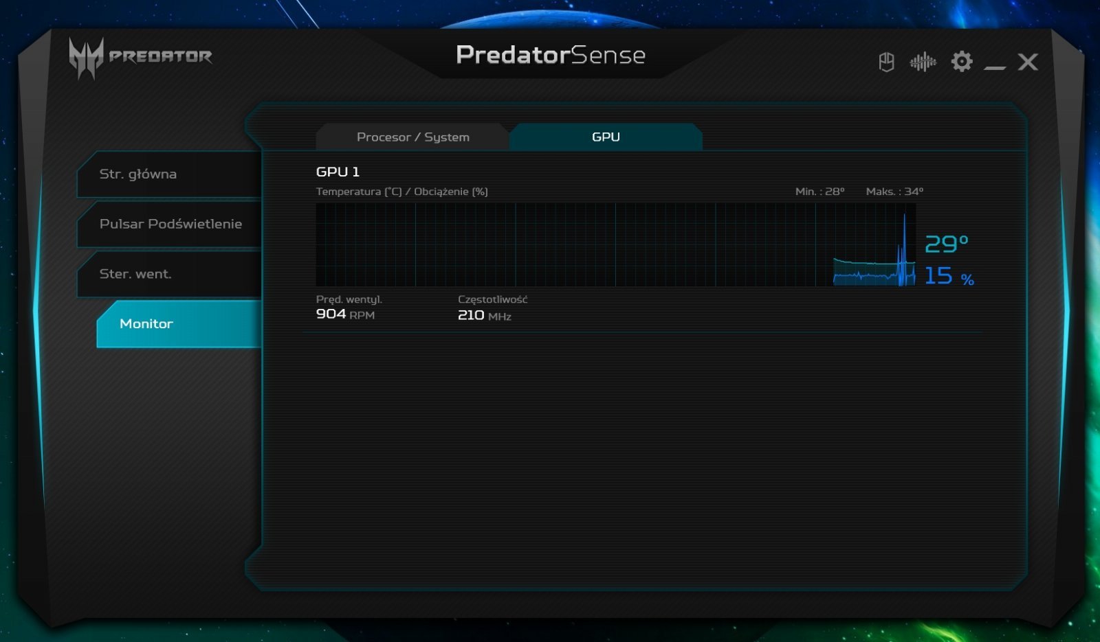 Skoro PC OEM, to i znalazło się oprogramowanie producenta preinstalowanie wraz z Windowsem – PredatorSense. Cóż mogę o tym powiedzieć – serio dobry program, prosty, czytelny, pokazuje najważniejsze parametry komputera plus pozwala nimi zarządzać – czy można chcieć coś więcej?
