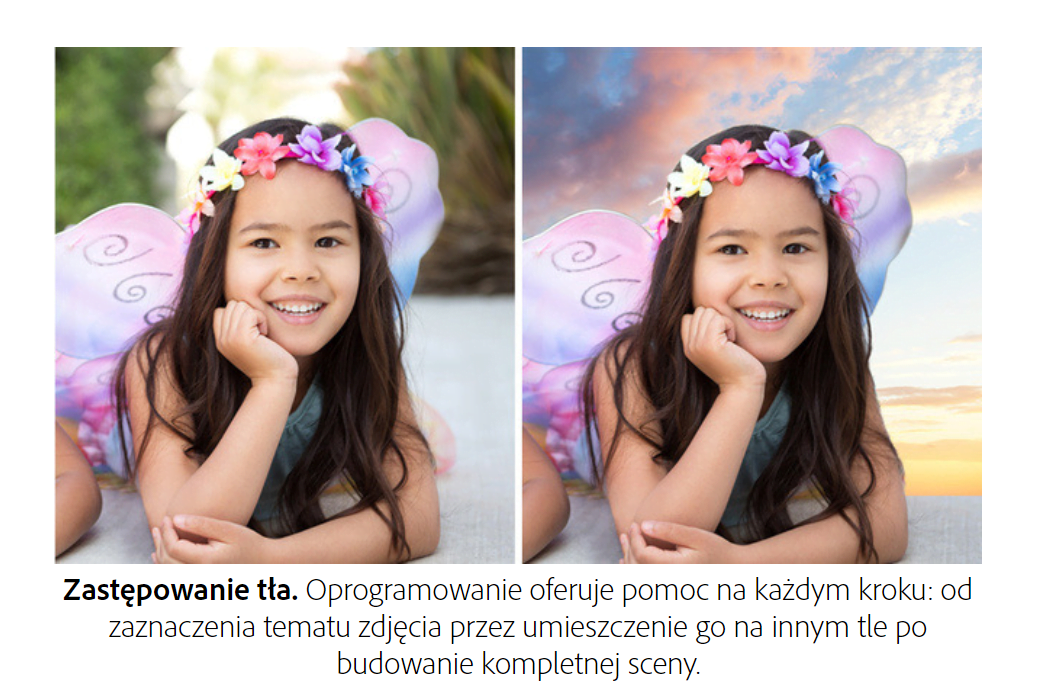 Photoshop pomoże poprawić zdjęcie, na którym dziecko zamrugało akurat w najgorszym momencie, ułatwi zmianę tła na zupełnie inne lub ułatwi stworzenie interesujących efektów tekstowych ze zdjęć, wszystko przy minimalnej liczbie kliknięć – w końcu to program dla amatorów.