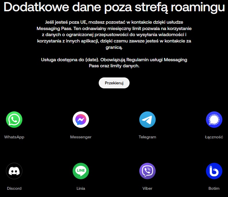 Poniżej wymienione są aplikacje, z których można korzystać w ramach Messaging Pass. Są to: WhatsApp, Messenger, Telegram, Signal, Discord, Line, Viber i Botim. Na stronie Revolut nie ma regulaminu tej usługi, ale można na niej znaleźć informację, że to pakiet „co najmniej 500 MB” z ograniczeniem prędkości do 16 kbps. Ma być on dostępny do 30 kwietnia 2026 roku.
