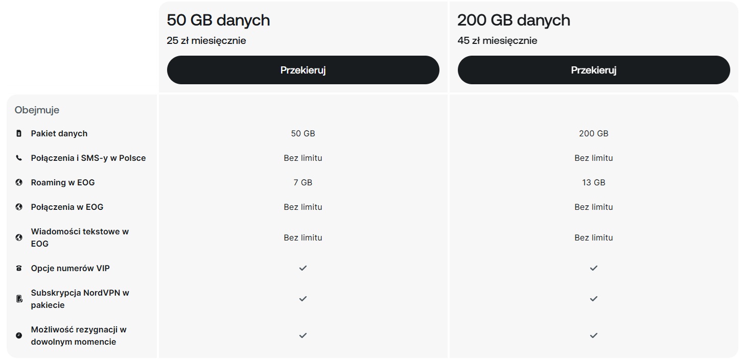 Oferta Revolut Mobile obejmuje dwa plany mobilne – za 25 złotych miesięcznie z pakietem 50 GB w Polsce i 7 GB w roamingu w Europejskim Obszarze Gospodarczym oraz za 45 złotych miesięcznie z paczką 200 GB w kraju i 13 GB w roamingu w EOG.