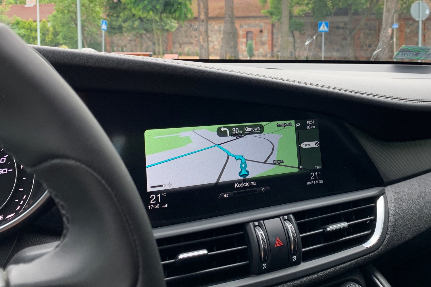 Mapa nawigacji, jak i wskazania najbliższych manewrów, prezentują się dobrze. Nie miałem żadnych problemów z wybraniem odpowiedniej drogi po zobaczeniu wskazówek na ekranie Alfy Romeo. Mapa dostarcza też informacji o stacjach paliw po drodze, co jak najbardziej należy wpisać na listę zalet – Giulia w wydaniu Veloce 280 KM potrafi mieć zaskakująco wysokie spalanie.