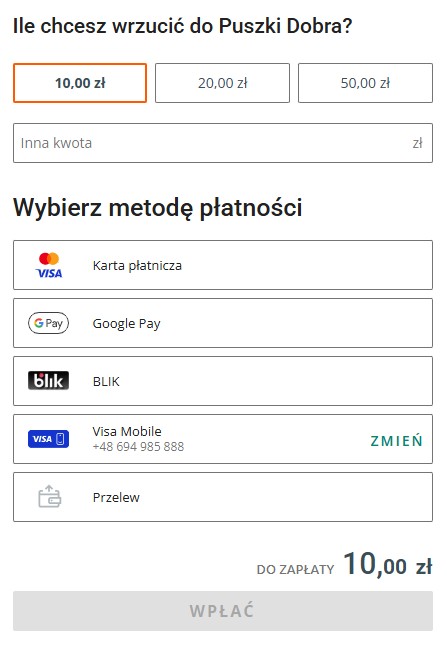 Po wybraniu opcji Wpłać do Puszki Dobra użytkownik zostaje przekierowany na stronę płatności. Możesz wybrać kwotę, jaką chcesz „wrzucić” do wirtualnej puszki – 10, 20, 50 złotych lub wprowadzić własną kwotę. Wśród metod płatności znalazła się karta płatnicza, Google Pay, Blik, Visa Mobile oraz tradycyjny przelew.