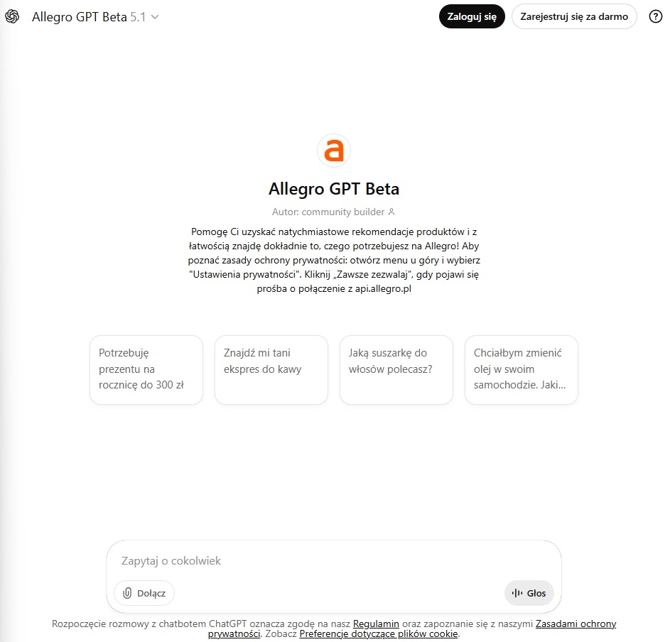 Allegro GPT (w wersji beta), dostępny bezpłatnie za pośrednictwem ChatGPT, jest bezpośrednio zintegrowany z bazą danych Allegro poprzez API. Dzięki temu jest – przynajmniej według założeń – w stanie przeszukiwać ją w czasie rzeczywistym i przedstawić wyniki, najlepiej pasujące do tego, co wpisał użytkownik. Po uruchomieniu narzędzia wyświetlane są przykładowe pytania, jednak można też wpisać swoje, jeśli chce się znaleźć coś innego.