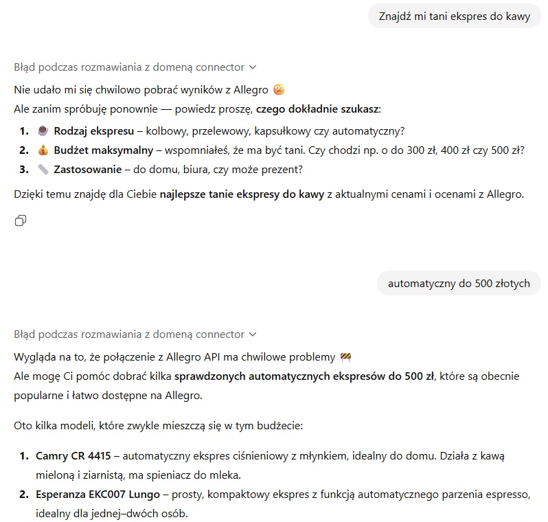 AllegroGPT jest dostępny dla każdego pod tym adresem. Za pierwszym razem, gdy wpisałem Znajdź mi tani ekspres do kawy i następnie doprecyzowałem, że chodzi mi o automatyczny do 500 złotych, każdorazowo wyskakiwał błąd podczas rozmawiania z domeną connector. ChatGPT informował, że nie udało mu się pobrać wyników z Allegro i wygląda na to, że połączenie z Allegro API ma chwilowe problemy.