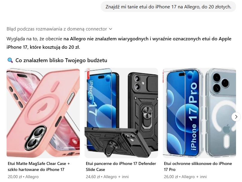 Postanowiłem dać mu drugą szansę i tym razem zleciłem znalezienie etui do iPhone 17, które kosztują nie więcej niż 20 złotych. Tutaj ponownie wyskoczył błąd podczas rozmawiania z domeną connector. Bot nie znalazł na Allegro żadnego etui do 20 złotych, mimo że jak najbardziej takie są dostępne, gdy skorzysta się z wyszukiwarki na platformie.