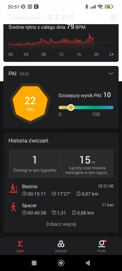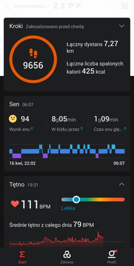 Zepp to standardowa apka do obsługi urządzeń wearable, która nie ma w sobie nic zaskakującego. Program został podzielony na 3 główne zakładki: Start, Zdrowie oraz Profil. Na pierwszej z nich, która uruchamia się automatycznie po włączeniu aplikacji, znajdziemy dane dotyczące dzisiejszej aktywności oraz odbytych treningów. Z tych kart możemy bezpośrednio przejść do wykresów np. tych dotyczących pomiaru pulsu czy snu.