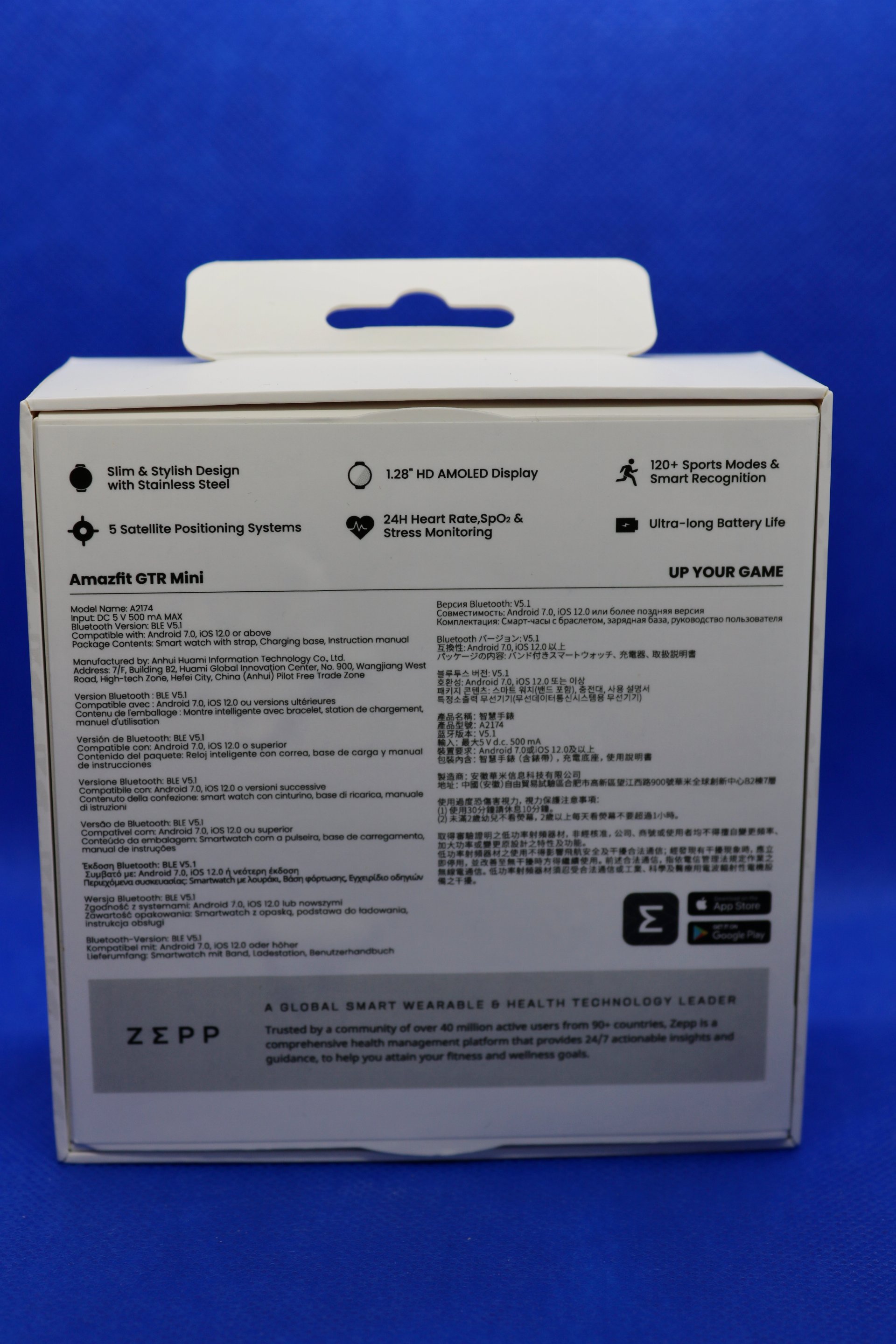 Nie inaczej jest w przypadku Amazfit GTR Mini. Samo pudełko prezentuje się dość standardowo – mimo, że to zegarek z dopiskiem „Mini” w nazwie, opakowanie, w którym trafia do klientów, nie jest wcale mniejsze od tych, w których dostarczane są standardowych rozmiarów smartwatche.