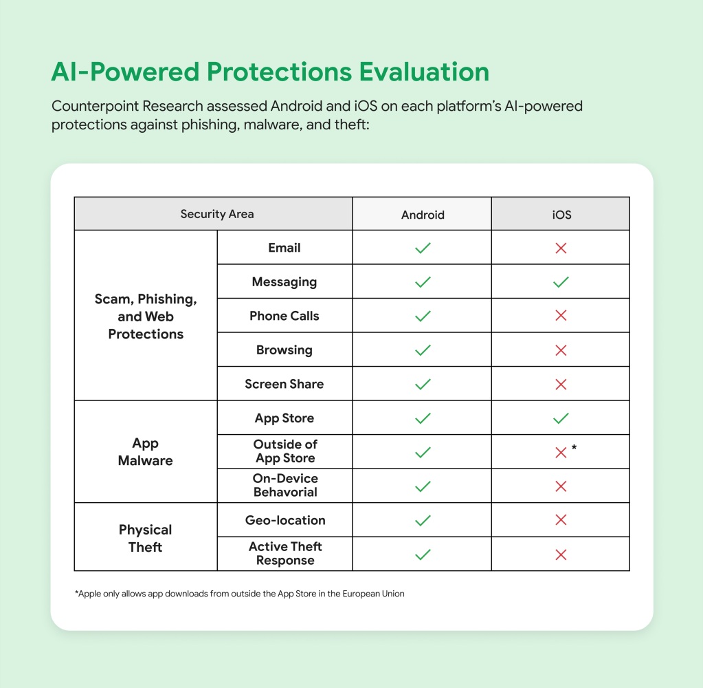 Nie tylko ankieta przeprowadzona przez Google wskazała, że posiadacze smartfonów z Androidem mają mniejsze prawdopodobieństwo otrzymania oszukańczej wiadomości i stania się ofiarą oszustwa. Firma Counterpoint Research oceniła bowiem oba systemy pod kątem zabezpieczeń opartych na sztucznej inteligencji, chroniących przed phishingiem, złośliwym oprogramowaniem i kradzieżą. Również w tym przypadku Android zdeklasował iOS.