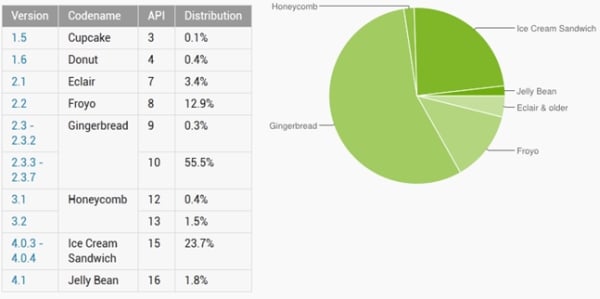 Największą bolączką systemu operacyjnego Android jest jego fragmentacja. Na rynku funkcjonują urządzenia z aż ośmioma wersjami platformy, począwszy od 1.5 Cupcake (który niebawem powinien całkowicie zniknąć – obecny udział w rynku to ledwie 0,1%; spadek z 0,2% względem ubiegłego miesiąca) po 4.1 Jelly Bean (sukcesywnie rośnie – 1,8%; wzrost z 1,2%). Jak obecnie przedstawia się procentowy podział rynku pomiędzy poszczególne edycje Androida?