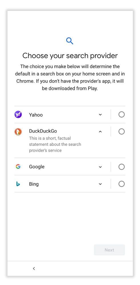 Każdy dostawca musi podać Google kwotę, którą jest w stanie zapłacić za jednego użytkownika. Trzy firmy skłonne wydać najwięcej zostaną następnie uwzględnione na liście. Oczywiście to rozwiązanie nie spodobało się twórcom innych wyszukiwarek. Eric Leandri, dyrektor generalny Qwant, stwierdził, że Google w ten sposób wykorzystuje swoją dominującą pozycję. Z kolei Gabriel Weinberg, pełniący rolę CEO w DuckDuckGo, powiedział, że firma będzie zarabiać kosztem konkurencji.