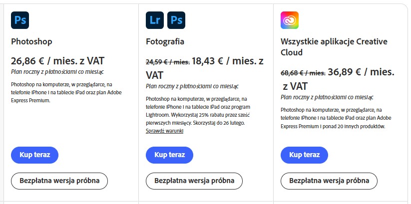 Adobe oferuje też opcję „Wszystkie aplikacje Creative Cloud” z chmurą 100 GB i limitem środków na funkcje AI do 1000 miesięcznie. Pakiet ten obejmuje ponad 20 programów i aplikacji mobilnych, w tym Photoshop i Lightroom, a także plan Adobe Express Premium. Pakiet ten jest dostępny w promocji i aktualnie kosztuje 36,89 euro za miesiąc, zamiast 68,68 euro za miesiąc.
