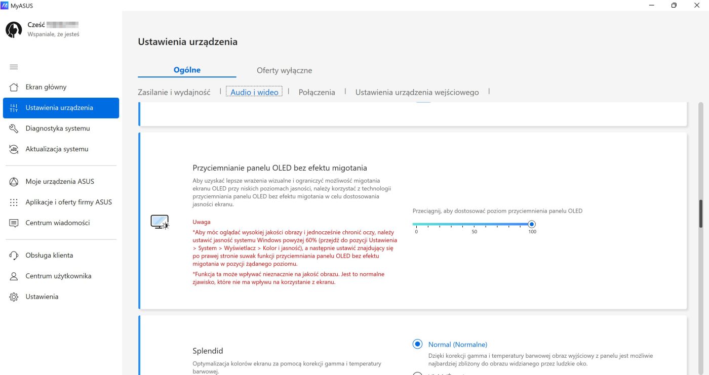 Podobnie jak przy oświetleniu RGB, dedykowana aplikacja Asusa stanowi źródło kilku dodatkowych ustawień. To w niej zoptymalizujemy pracę wyświetlacza, dzięki ustawieniom Asus OLED Care lub dostosujemy gamę kolorów.