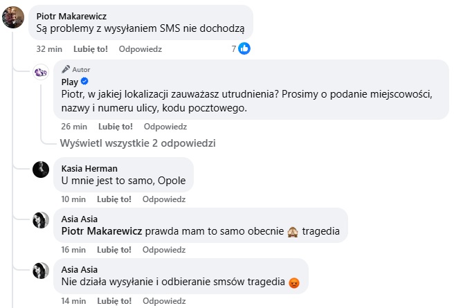 Klienci Play masowo również zgłaszają problemy z wysyłaniem i otrzymywaniem SMS na oficjalnym profilu Play na platformie Facebook. Osoby prowadzące fanpejdż zdają się jednak nie zdawać sobie sprawy z ogólnopolskiej awarii, mimo chęci pomocy.