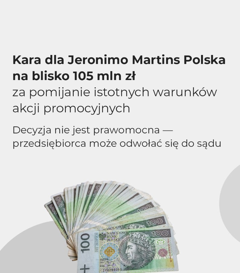 W związku z tym UOKiK nałożył na spółkę Jeronimo Martins Polska karę sięgającą niemalże 105 milionów złotych. Urząd podkreśla jednak, że decyzja nie jest prawomocna, a przedsiębiorstwo może złożyć odwołanie do sądu.