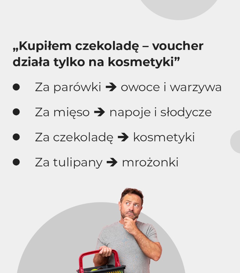 W teorii konsument miał otrzymać voucher o równowartości zakupu na kolejne sprawunki. W praktyce jednak klienci, np. kupując ptasie mleczko, otrzymywali voucher na zakup soków o minimalnej wartości 25 złotych. Takich przykładów jest więcej: za parówki klient dostał voucher na owoce i warzywa, za czekoladę – voucher na kosmetyki, a za mięso – kupon na napoje lub słodycze.