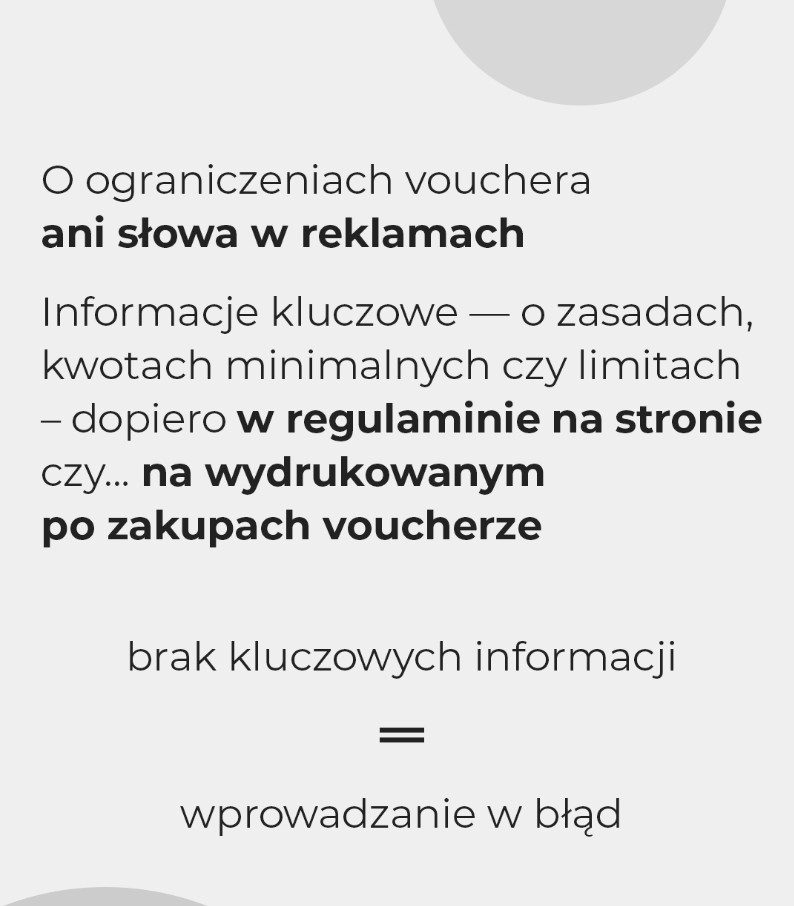 Konsumenci nie mogli wykorzystać otrzymanego vouchera na zakup dowolnego asortymentu. Musieli przeznaczyć środki z kuponu na produkty z wybranej przez Biedronkę kategorii, zwykle niezwiązanej z asortymentem, za który otrzymano voucher. Dowiadywali się jednak o tym dopiero po zrobieniu zakupów, dokonaniu płatności i otrzymaniu papierowego vouchera wydrukowanego z kasy.
