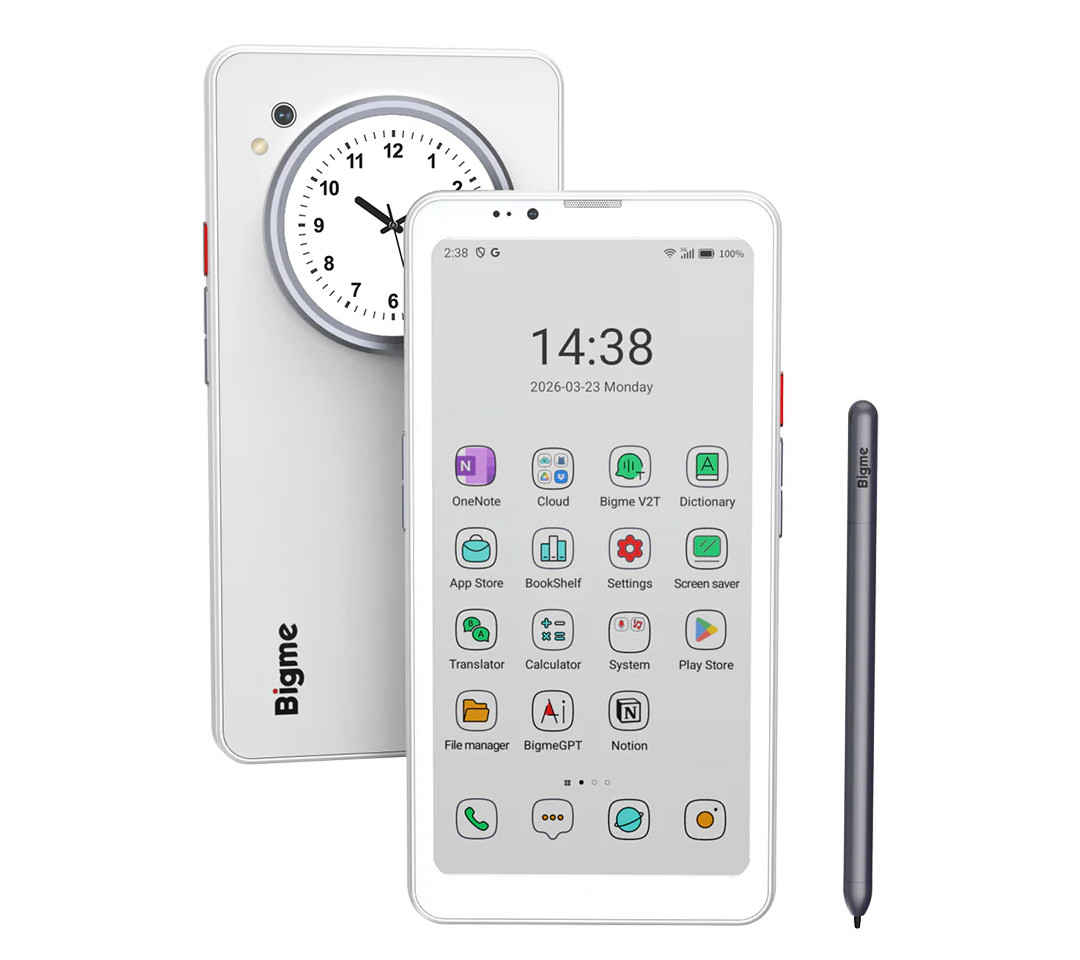 BigMe HiBreak Dual swoją nazwę zawdzięcza faktowi, że został wyposażony nie w jeden, lecz dwa wyświetlacze. Ten główny to faktycznie kolorowy panel E Ink o przekątnej 6,13 cala – cechuje go zagęszczenie pikseli na poziomie 150 PPI w kolorze oraz 300 PPI w trybie monochromatycznym. Z tyłu natomiast zainstalowany został okrągły ekran LCD o średnicy 1,85 cala i rozdzielczości 360×360 pikseli.