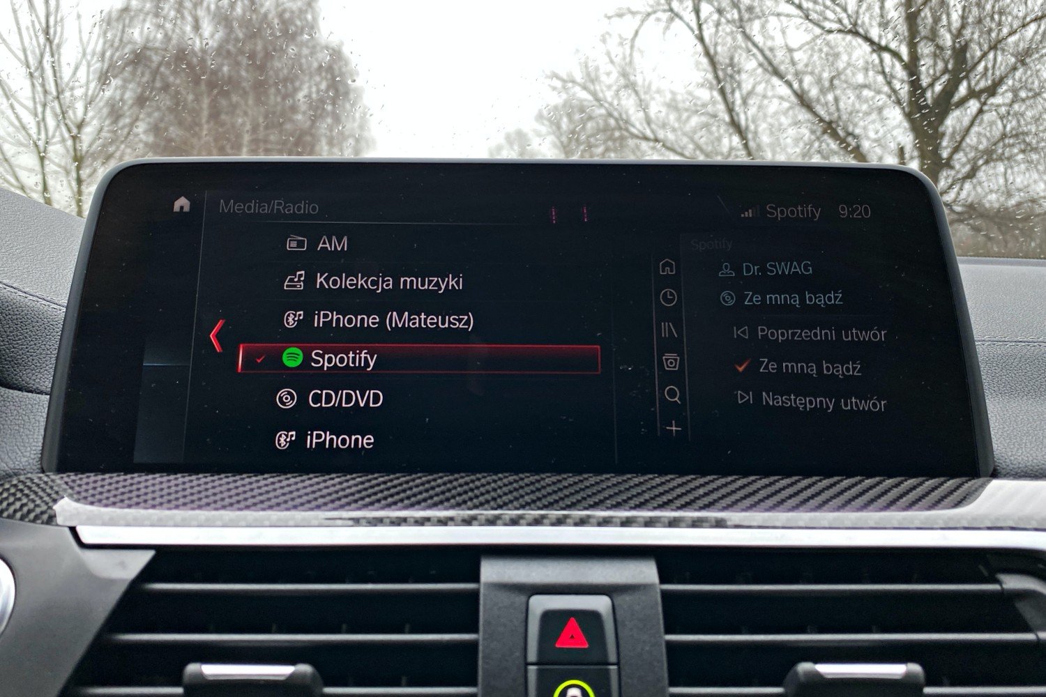 Oczywiście nie zabrakło opcji połączenia ze smartfonem. Interesująco rozwiązano odtwarzanie muzyki, gdy korzystamy ze Spotify. W podstawowym odtwarzaczu BMW nie mamy dostępu do biblioteki i utworzonych playlist, możemy tylko przełączać się między utworami. Co ciekawe, wszystko to dostępne jest w przypadku Apple Music. Natomiast, gdy preferujemy Spotify, warto sięgnąć po dedykowaną aplikację zainstalowaną w BMW. To właśnie ona pozwala na przeglądanie całej biblioteki zapisanej w Spotify. Nie musimy więc używać Apple CarPlay, aby chociażby wybrać konkretną playlistę za pomocą pokrętła iDrive.