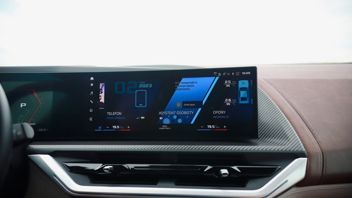Nie mamy fizycznego panelu sterowania klimatyzacją. Owszem, zmiana temperatury jest wygodna i prosta, bowiem odpowiednie przyciski cały czas znajdują się na dole ekranu. Gorzej jednak, gdy chcemy zmienić ustawienia kierunku nawiewu czy jego siłę – wówczas naszym oczom ukazuje się przesadnie skomplikowane i rozbudowane menu. Podobno BMW poprawiło to w iDrive 8.5, ale jeszcze nie miałem z nim styczności, więc trudno mi odnieść się do wdrożonych zmian.