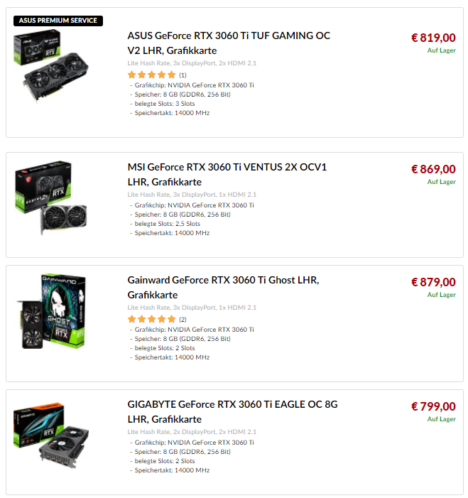 W przypadku wariantu GeForce RTX 3070 Ti można dostrzec cenę wyższą o 20 euro na podstawie modelu produkcji Gigabyte Aorus.