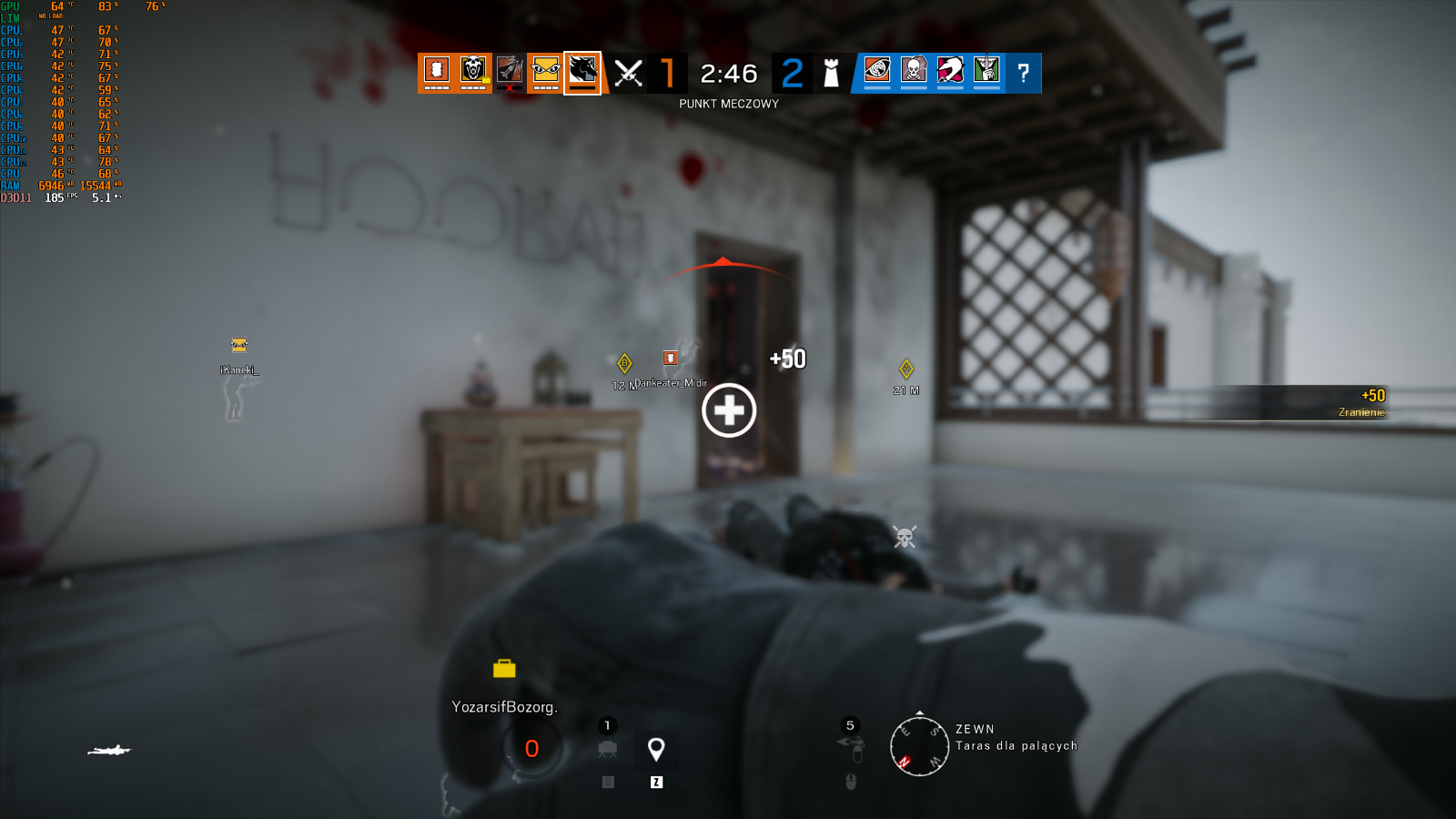 Bardzo fajne i stabilne wyniki – podczas rozgrywki 185 FPS i trochę cieplej, ale dalej idealnie – 46 stopni.