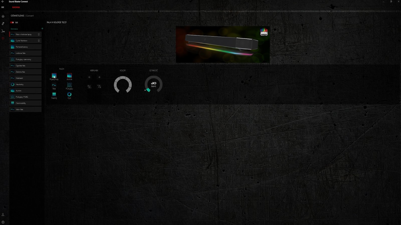 Z poziomu Sound Blaster Connect możemy sterować oświetleniem Aurora Reactive w naprawdę rozbudowany sposób. Możemy wybrać ruch pojedynczy, falę, nastrój, cykl pulsujący albo aurora. Dostępne są również opcje odpowiadające za kierunek tego ruchu, jak i predefiniowane ustawieniach oświetlenia, na przykład fala ognista / lodowa czy cycle rainbow.