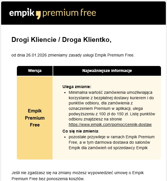 12 czerwca 2025 roku zaczął obowiązywać zaktualizowany regulamin Empik Premium Free i nowe zasady dla jego użytkowników. Przede wszystkim od tego dnia nie można już dołączyć do grona subskrybentów tego planu, ale osoby, które wcześniej do niego należały, nadal mogą z niego korzystać. Od 26 stycznia 2026 roku na nowych, mniej korzystnych zasadach.