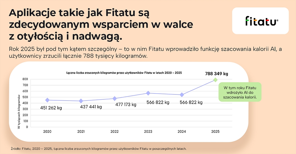 Okazuje się, że sztuczna inteligencja faktycznie może okazać się pomocna w jednym z kluczowych elementów diety, czyli zwracaniu uwagi na kaloryczność posiłków. Twórcy aplikacji Fitatu mogą bowiem pochwalić się, że użytkownicy łącznie zredukowali blisko 800 tys. kilogramów w 2025 roku.