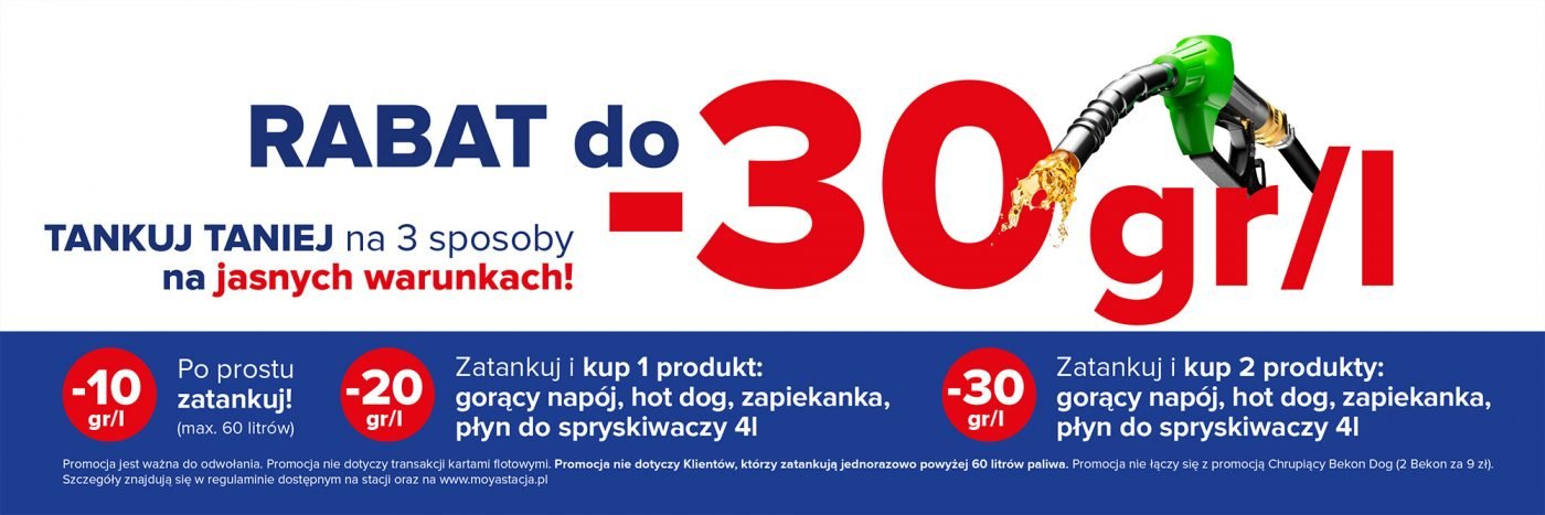 Klient, który zatankuje benzynę 95 lub 98 albo olej napędowy bądź ON MOYA Power, otrzyma 10 groszy rabatu na każdy litr paliwa. Jeśli kierowca kupi również na stacji dowolny gorący napój, hot-doga, zapiekankę lub płyn do spryskiwaczy – rabat wzrośnie do 20 groszy na każdy litr. Jeżeli natomiast ktoś kupi jednocześnie dwa ww. produkty, dostanie już 30 groszy rabatu na każdy litr.
