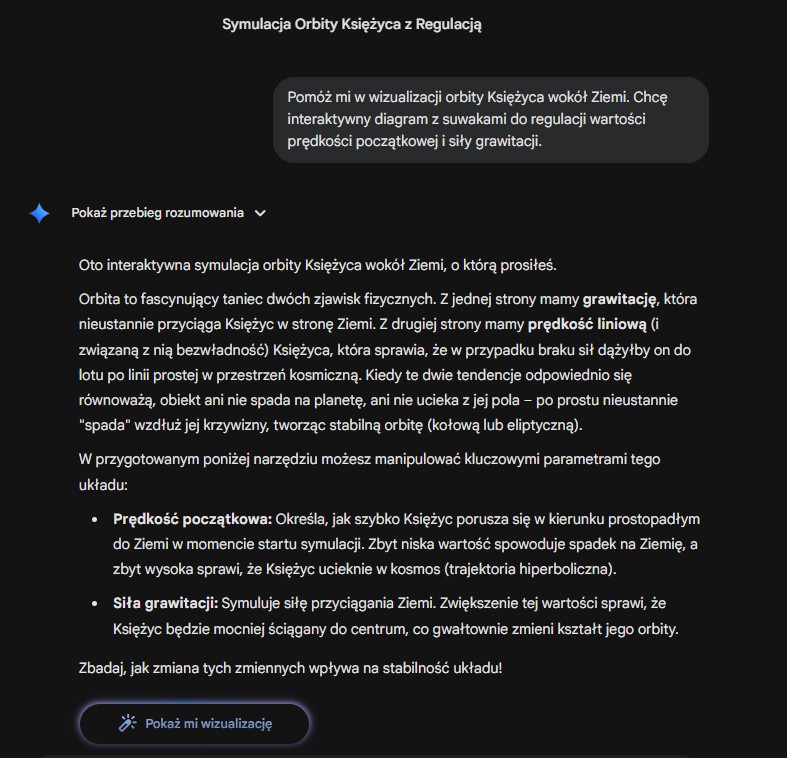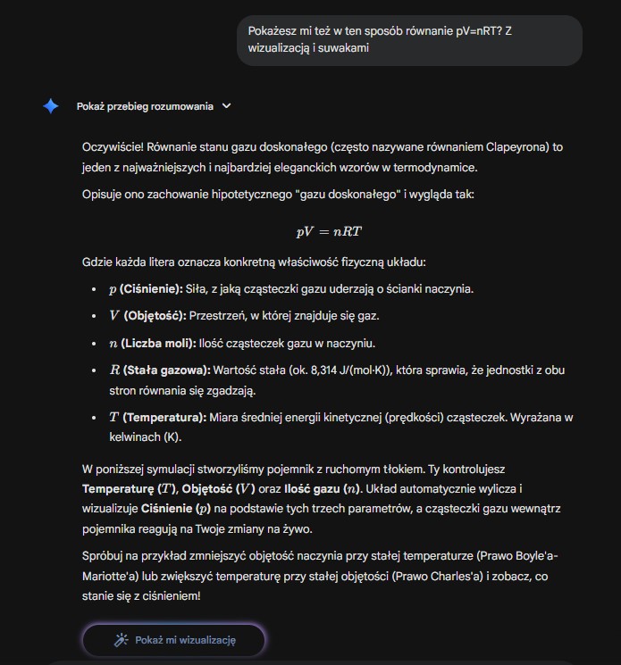 Aplikacja Gemini zyskuje możliwość generowania interaktywnych symulacji oraz modeli, a także niestandardowych czy interaktywnych wizualizacji. Google wdraża te funkcje bezpośrednio do czatu, dzięki czemu użytkownik w jednym oknie zobaczy nie tylko objaśnienie danego tematu krok po kroku, ale również jego odwzorowanie w postaci symulacji.