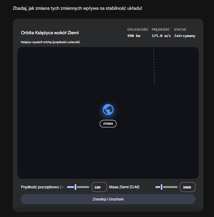 Jednym z przykładów, prezentowanych przez giganta z Mountain View, jest eksploracja orbity Księżyca wokół Ziemi. Według firmy użytkownik nie musi ograniczać się do sztywnego diagramu, bo dzięki suwakom dodanym do wizualizacji można regulować np. prędkość początkową czy siłę grawitacji i sprawdzić, w jaki sposób zmieniają się te wartości, aby zachować stabilną orbitę.