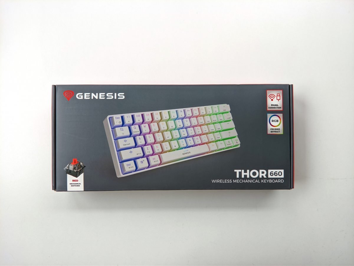 Klawiatura Genesis Thor 660 zapakowana jest w pudełko utrzymane w kolorystyce szarej połączonej z czerwienią – barwą marki. Na froncie znalazł się render produktu, nazwa oraz kilka informacji. Pierwsza i prawdopodobnie najważniejsza mówi nam o zamontowaniu w tym modelu przełączników mechanicznych Red. Druga informuje nas z kolei o możliwości podłączenia klawiatury zarówno po kablu, jak i bezprzewodowo, zaś trzecia – o obecności podświetlenia RGB.