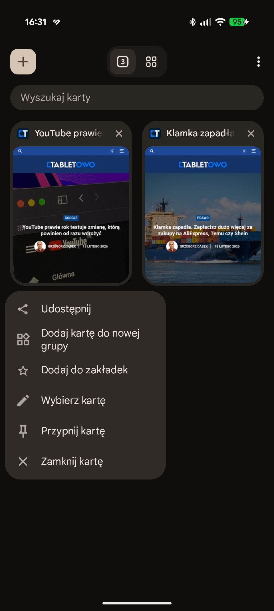 Dla wszystkich, którzy męczyli się z kartami, mamy świetną wiadomość. Google wreszcie zdecydowało się wyeliminować opisane braki. Otóż Google Chrome na Androidzie otrzymał długo wyczekiwane rozwiązanie pozwalające na przypinanie kart. Obecnie funkcja jest szeroka wdrażana wraz z wersją 144, która powinna być już dostępna do znacznej większości użytkowników w Google Play.