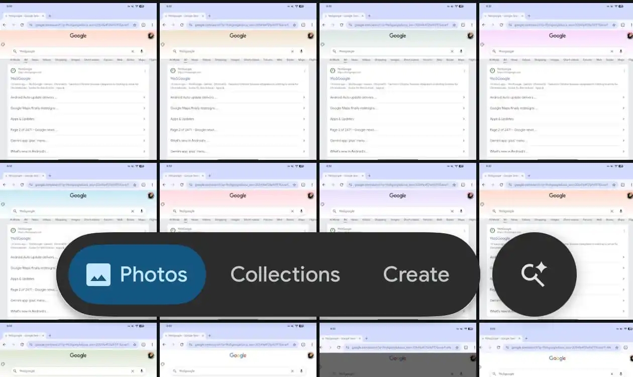 Aktualizacja w wersji na iOS wprowadza ruchomy pasek narzędzi, który składa się z trzech opcji – Zdjęcia, Kolekcje i Utwórz. Towarzyszy im oddzielny przycisk lupy, który umożliwia wyszukiwanie i zadawanie pytań. Nowy pasek od strony wizualnej przypomina element interfejsu, który jest jakby połączeniem Liquid Glass z wytycznymi Material 3 Expressive.