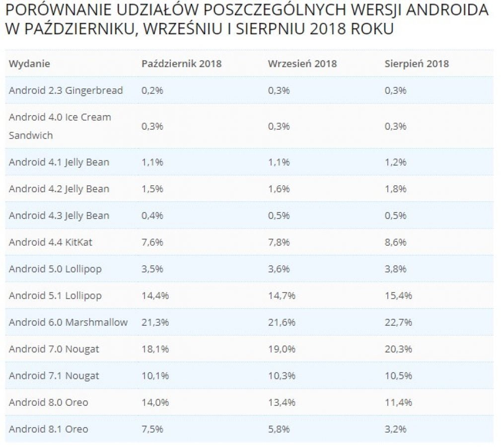 Ostatnia aktualizacja statystyk udziału danej wersji Androida na rynku pochodzi z końca października i z niej dowiedzieliśmy się, że Pie nie widnieje jeszcze nawet w statystykach. Wiecie dlaczego pewne wersje Androida powoli odchodzą do lamusa? Bo po prostu przestaje się z nich korzystać.