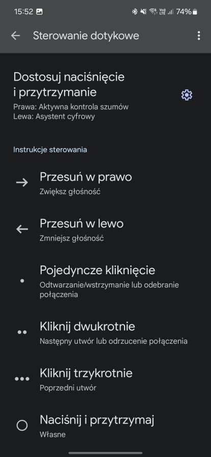 Pewną łyżką dziegciu jest brak możliwości edycji interakcji. Jedyne, co możemy zmienić, to dłuższe przytrzymanie, które – zamiast sterowania ANC – możemy przypisać do aktywacji asystenta głosowego dla jednej lub obu słuchawek.