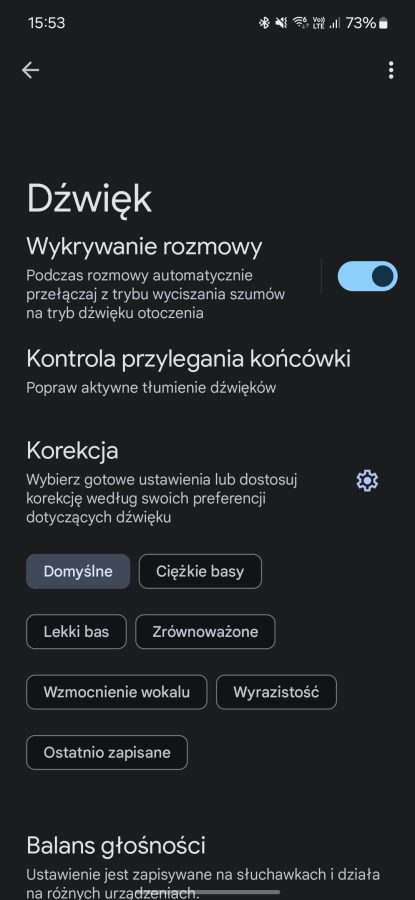 W ustawieniach dźwięku da się aktywować wykrywanie rozmów (o tym później) i nie zabrakło opcji korekcji brzmienia. Znalazło się tu pięć gotowych presetów, a także uproszczony equalizer. Uproszczony, bo sprowadza się do pięciu suwaków opisanych jako górny sopran, sopran, mid, bas i niski bas. Możemy włączyć też wzmacnianie niskich i wysokich tonów przy niższych głośnościach.