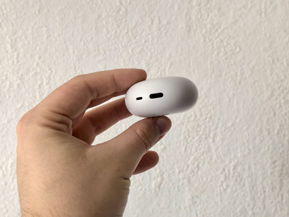 Klapka futerału nieco chybocze się na boki i nieco trzeszczy, ale nie jest to nad wyraz rażący problem. Od frontu dyskrytnie umieszczono diodę LED, która może świecić na biało lub pomarańczowo, na spodzie ulokowany został głośniczek (do lokalizowania i sygnalizacji parowania oraz startu ładowania) oraz port USB-C. Z tyłu, na samym dole, znajdziemy zaś przycisk do parowania i ewentualnego resetu ustawień.