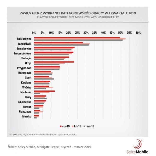Profil demograficzny mobilnego gracza ukazuje, że 61% z nich to kobiety. Mężczyźni stanowią zaś zdecydowaną większość użytkowników gier z kategorii „Sport”, „Planszowe” i „Quizy”. W marcu tego roku średni dzienny czas korzystania z telefonu w grupie użytkowników gier mobilnych wyniósł 2 h 45 min, z czego ponad 20 minut każdego dnia zajmowało im granie. Najwięcej czasu pochłaniają gry karciane, ale najwyższy zasięg odnotowuje kategoria gier rekreacyjnych. Zaliczają się do niej takie tytuły jak Pou, My Talking Tom czy Candy Crush Saga.