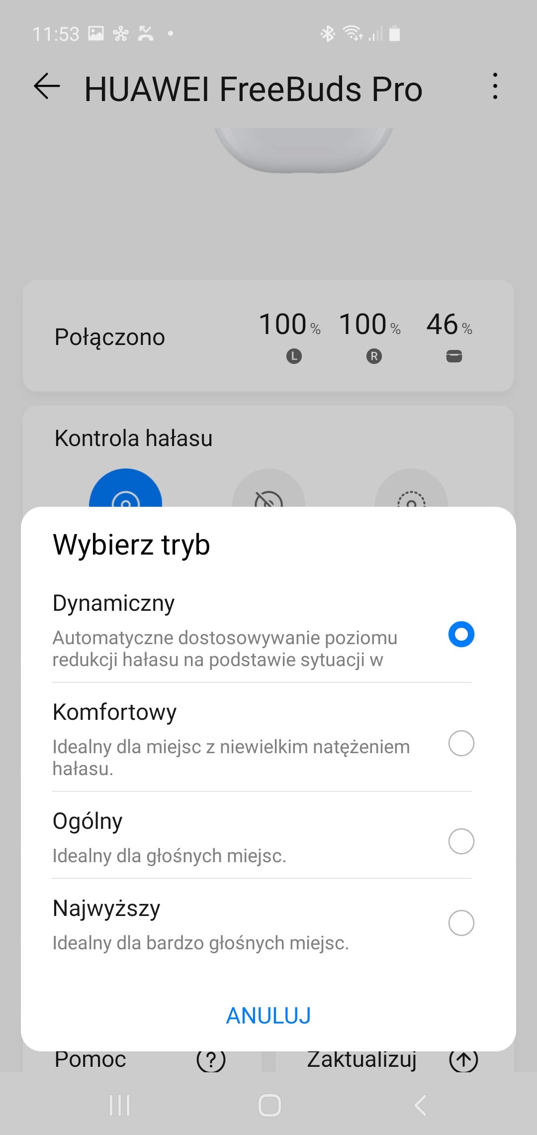 Mechanizm ANC w Huawei FreeBuds Pro działa bardzo dobrze, jednak mam wrażenie, że stopniowanie efektu zostało do niego doklejone na siłę. Domyślny, dynamiczny profil, wydaje się nie różnić zupełnie niczym od pozostałych, dostępnych w aplikacji.