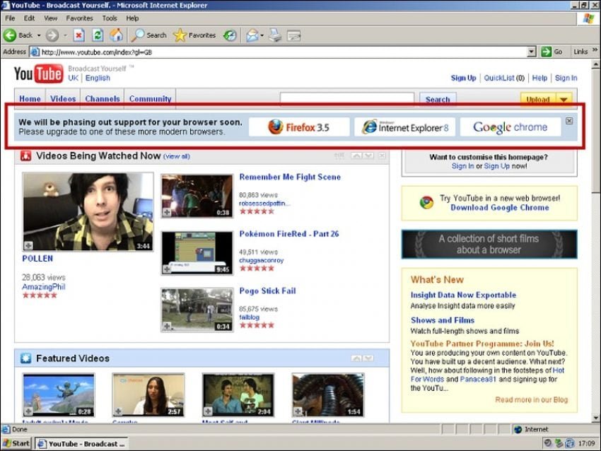 Mimo licznych problemów, Google twierdził, że YouTube musi wspierać szóstą wersję Internet Explorera. Po pierwsze, 18% użytkowników wciąż korzystało z IE 6. Po drugie, YouTube miał docierać również do osób, które nie mogą przeprowadzić aktualizacji do nowszej wersji Internet Explorera lub pracują w firmach, w których jedyną słuszną przeglądarką był „potworek Microsoftu”.