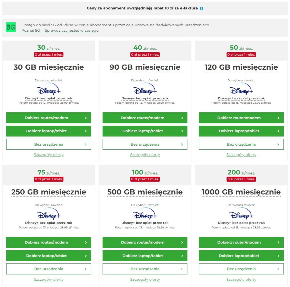 Operator ma aż sześć ofert na internet mobilny na abonament (z dostępem do technologii 5G w każdej taryfie). W każdym przypadku umowa podpisywana jest na 24 miesiące. W ramach promocji opłata za pierwszy miesiąc wynosi 0 złotych, a jeśli klient przeniesie numer z innej sieci, zostanie zwolniony z opłaty abonamentowej przez trzy miesiące.